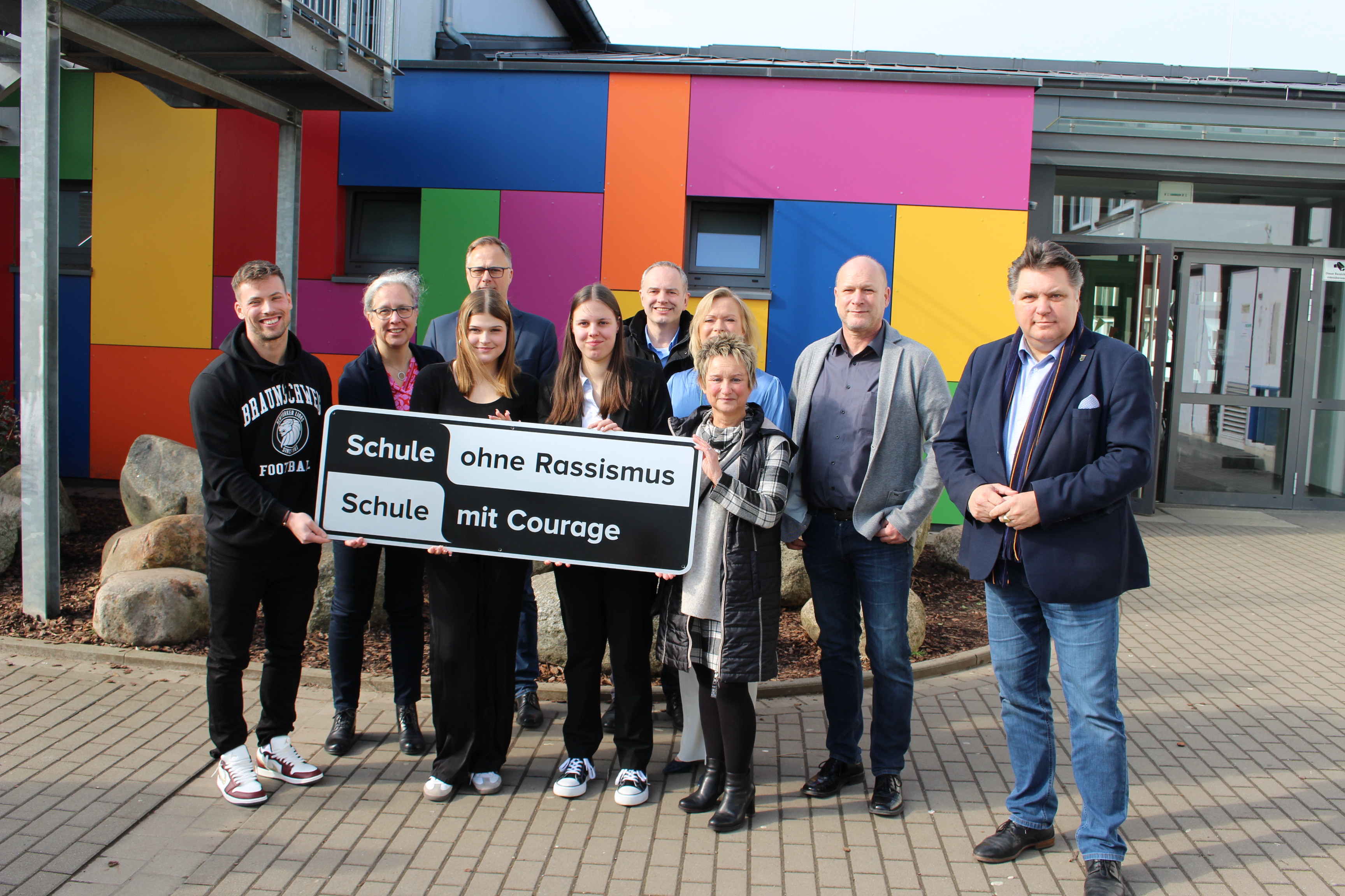 Ein besonderer Tag an der OBS Sickte: Die Oberschule ist nun offiziell Teil des bundesweiten Couragenetzwerks. Die Bundestagsabgeordnete Dunja Kreiser [SPD], Uwe Schäfer [stellvertr. Landrat, CDU], Bernd Retzki [leitender Dezernent für Schule und Sport], Ingo Geisler [Bürgermeister in Sickte], Tjorven Maack [AWO Regionalverband Harz] und Benjamin Krahl [Defense Back bei den New Yorker Lions] besuchten am