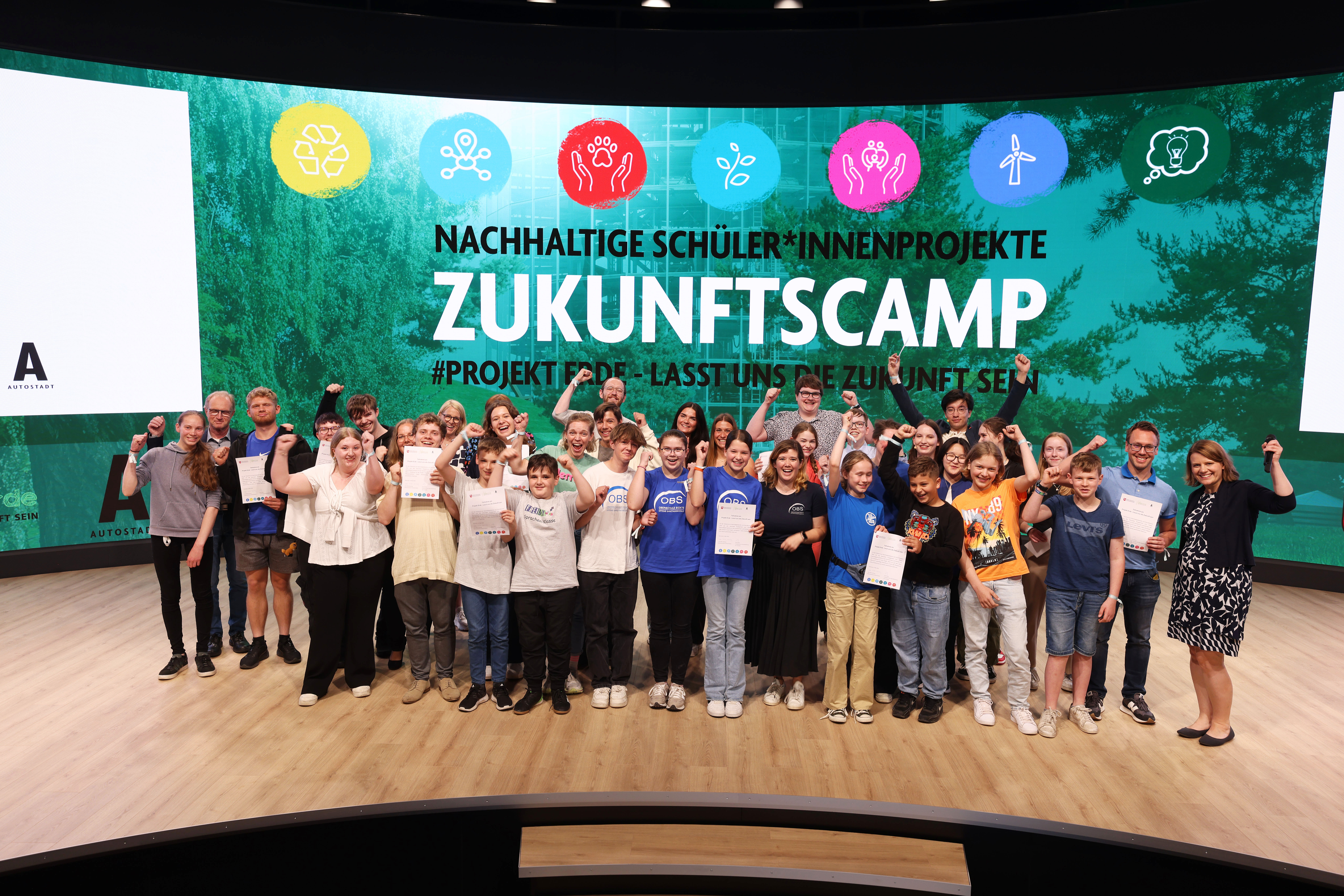 Nach zweitägiger Teilnahme am Zukunftscamp mit zwei Nachhaltigkeitsprojekten im Wettbewerb "Projekt Erde - Lasst uns die Zukunft sein" wurde die Oberschule Sickte am 24.05.24 mit einer Auszeichnung aus den Händen der Kultusministerin Julia Willie Hamburg prämiert. Das Präsentationsteam, das die Umweltprojekte "Schulgarten" und "Mülltrennung" in der Autostadt in Wolfsburg vor einer großen Jury des Kultusministeriums präsentierte, konnte gleich zwei Urkunden entgegennnehmen. Für das hervorragende Abschneiden in diesem landesweiten Wettbewerb haben viele Schüler:innen an der OBS Sickte unter der Leitung von Maren Zöllner sehr engagiert gearbeitet.